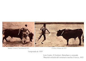 “Luis Castro, el Soldado. Su elegante y valeroso modo de torear con el capote, sobre todo a la verónica, sus buenas maneras con muleta y espada y su voluntad y arrojo, se impusieron rápidamente a los públicos españoles, consiguiendo ser el novillero de moda, en competencia con su compatriota Lorenzo Garza, de quien “El Soldado”, diestro pundonoroso, no se dejaba ganar la pelea fácilmente. También manejaba las banderillas con acierto y seguridad, aunque sin gran relieve de ejecución……………….Su exagerada propaganda, que a este torero no le faltaba nunca, llegó a perjudicarle notablemente cuando, a través de ella, intentó enfrentarse nada menos que con Domingo Ortega, entonces el amo del cotarro, de quien llegó a decir “El Soldado” en letras de molde que tenía miedo a alternar con él. Lo absurdo del reclamo produjo efectos bien contrarios, y su cartel comenzó a decaer”