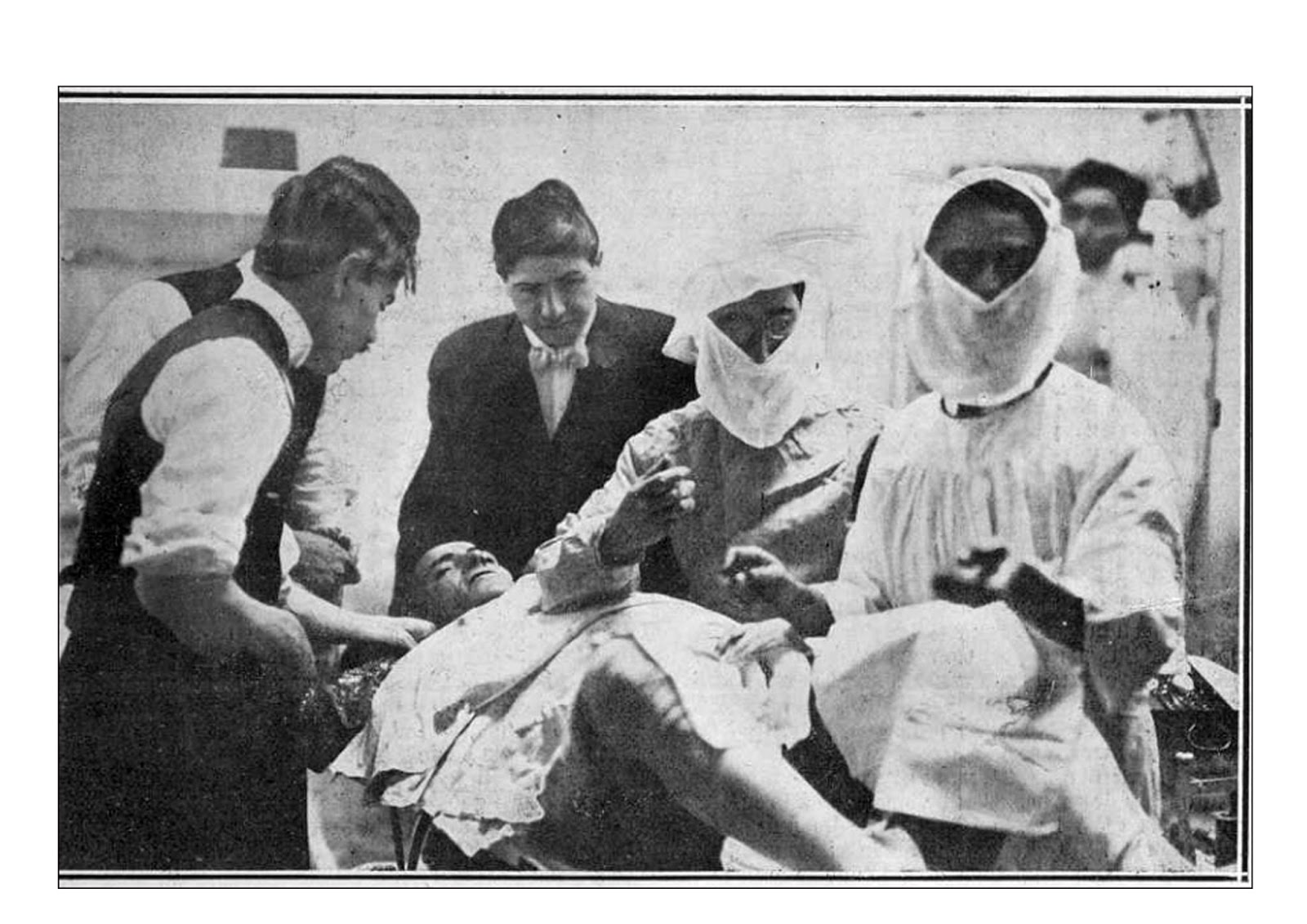 "La cogida de Belmonte.- Única fotografía que existe de la primera cura del fenómeno, en la enfermería de la Plaza. "El", anestesiado, en la cama de operaciones mientras le curan los eminentes cirujanos doctores Millán y Barrios."